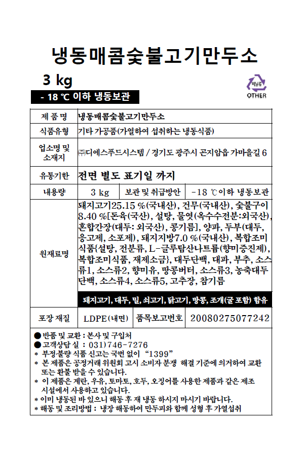 냉동매콤숯불고기만두소 (3kg)