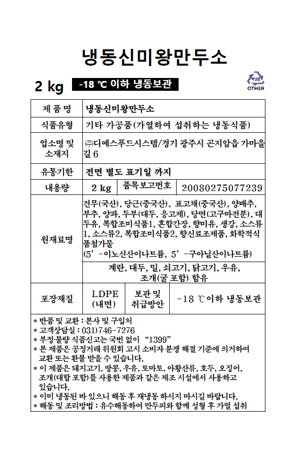 냉동신미왕만두소 (2kg)
