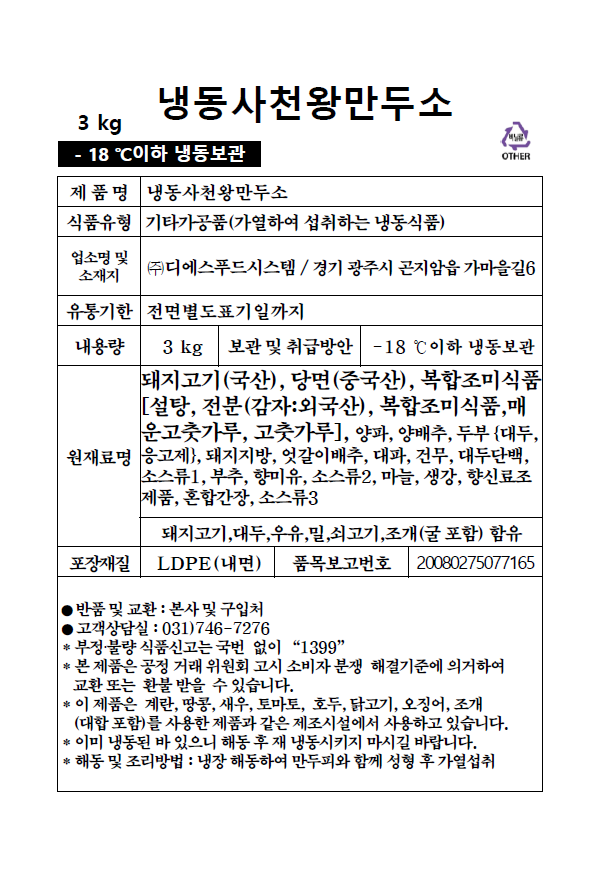 • 냉동사천만두소 (3kg)