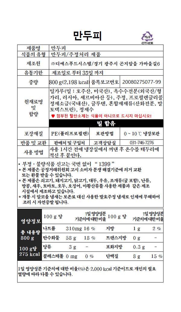 유전자재조합식품에 해당하는 경우의 표시 상품페이지 참고